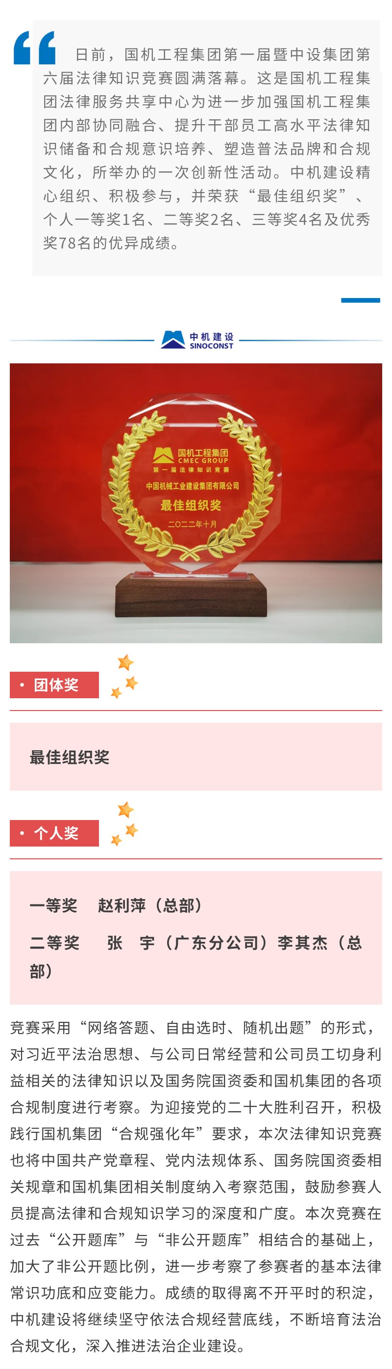 喜報(bào)!中機(jī)建設(shè)在國機(jī)工程集團(tuán)法律知識(shí)競賽中榮獲多個(gè)獎(jiǎng)項(xiàng)